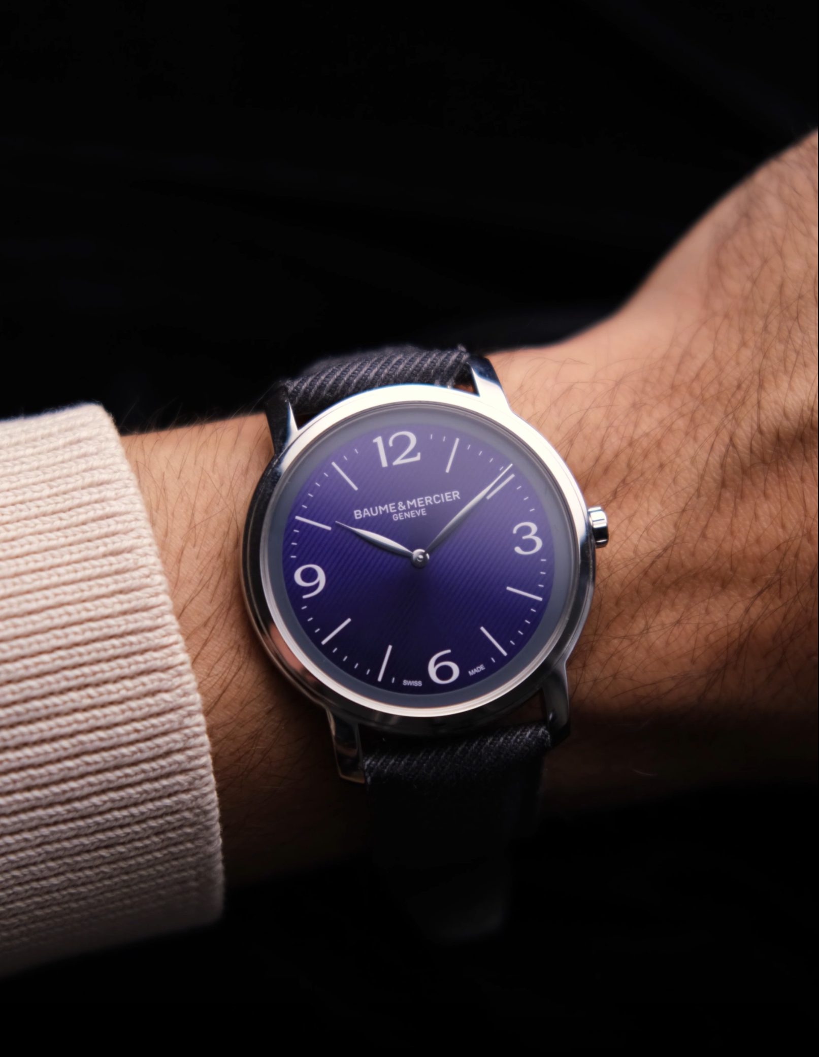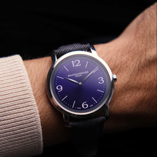 Este elegante Baume & Mercier Classima apresenta um mostrador azul marcante com padrão guilloché vertical sutil, alojado em uma caixa de aço inox polido. O design minimalista e as proporções refinadas fazem dele uma escolha atemporal para quem aprecia elegância discreta.