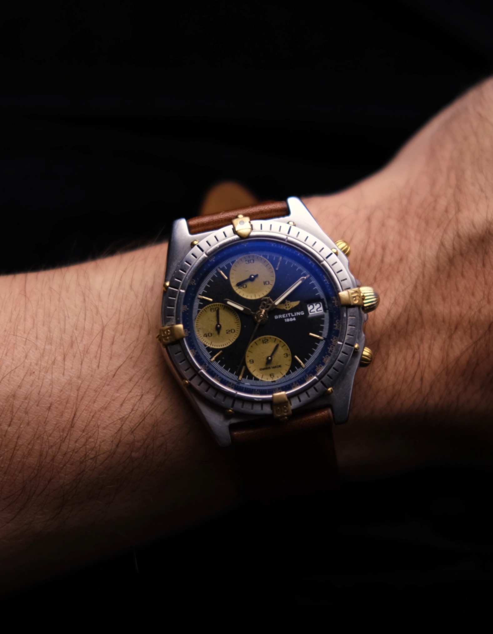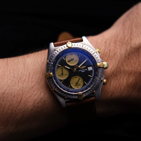 Este Breitling Chronograph vintage apresenta uma combinação única de mostrador azul com subdials dourados e caixa bicolor em aço e detalhes banhados a ouro. Com visual robusto e alma esportiva, é um verdadeiro clássico da relojoaria suíça dos anos 90.