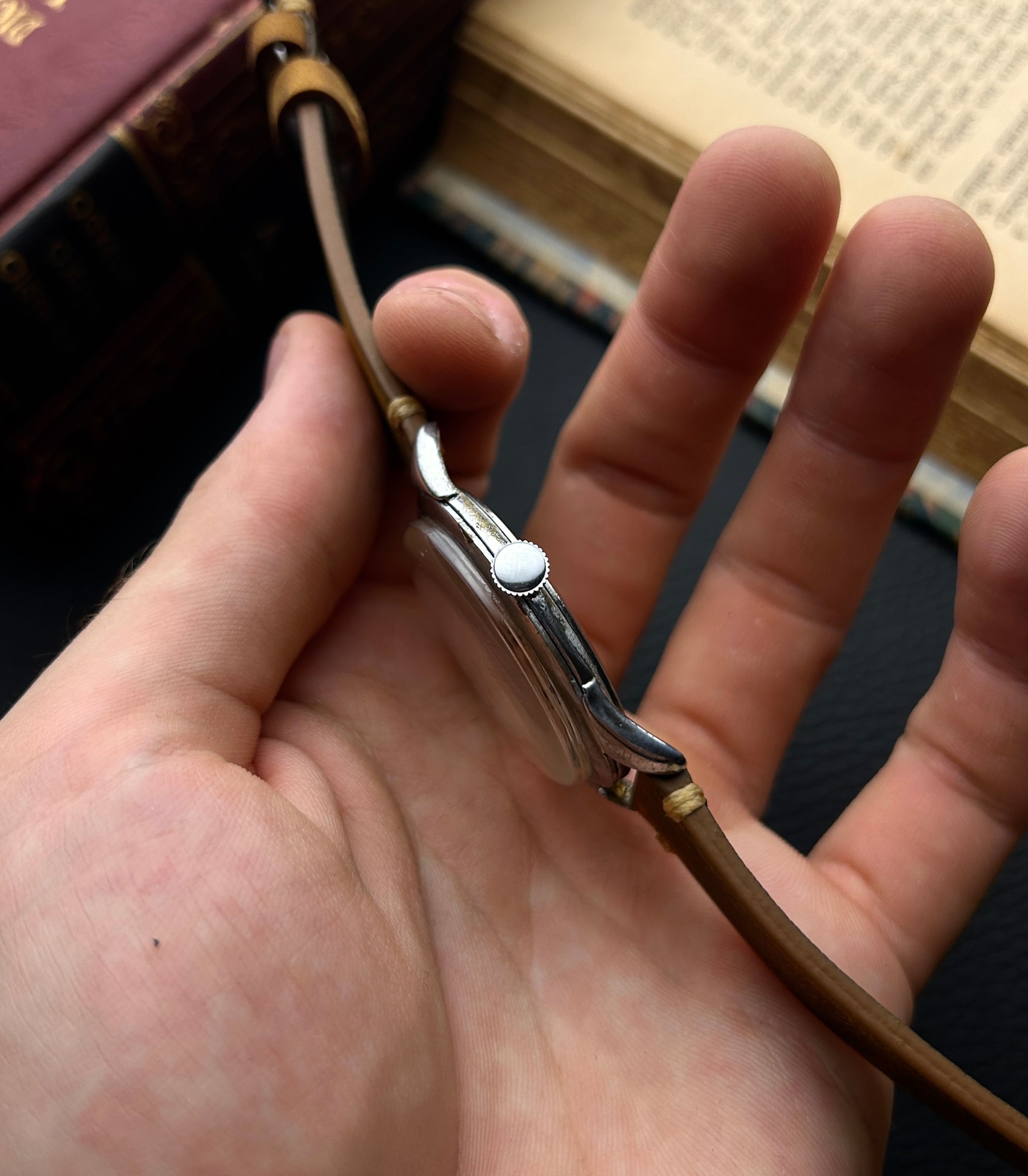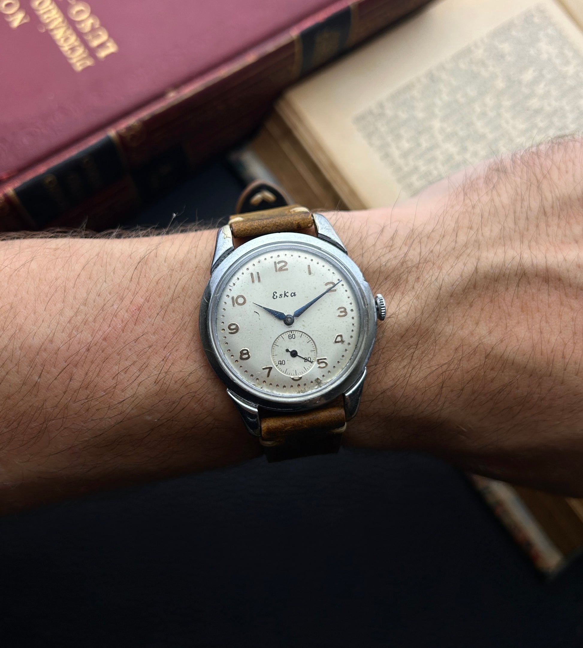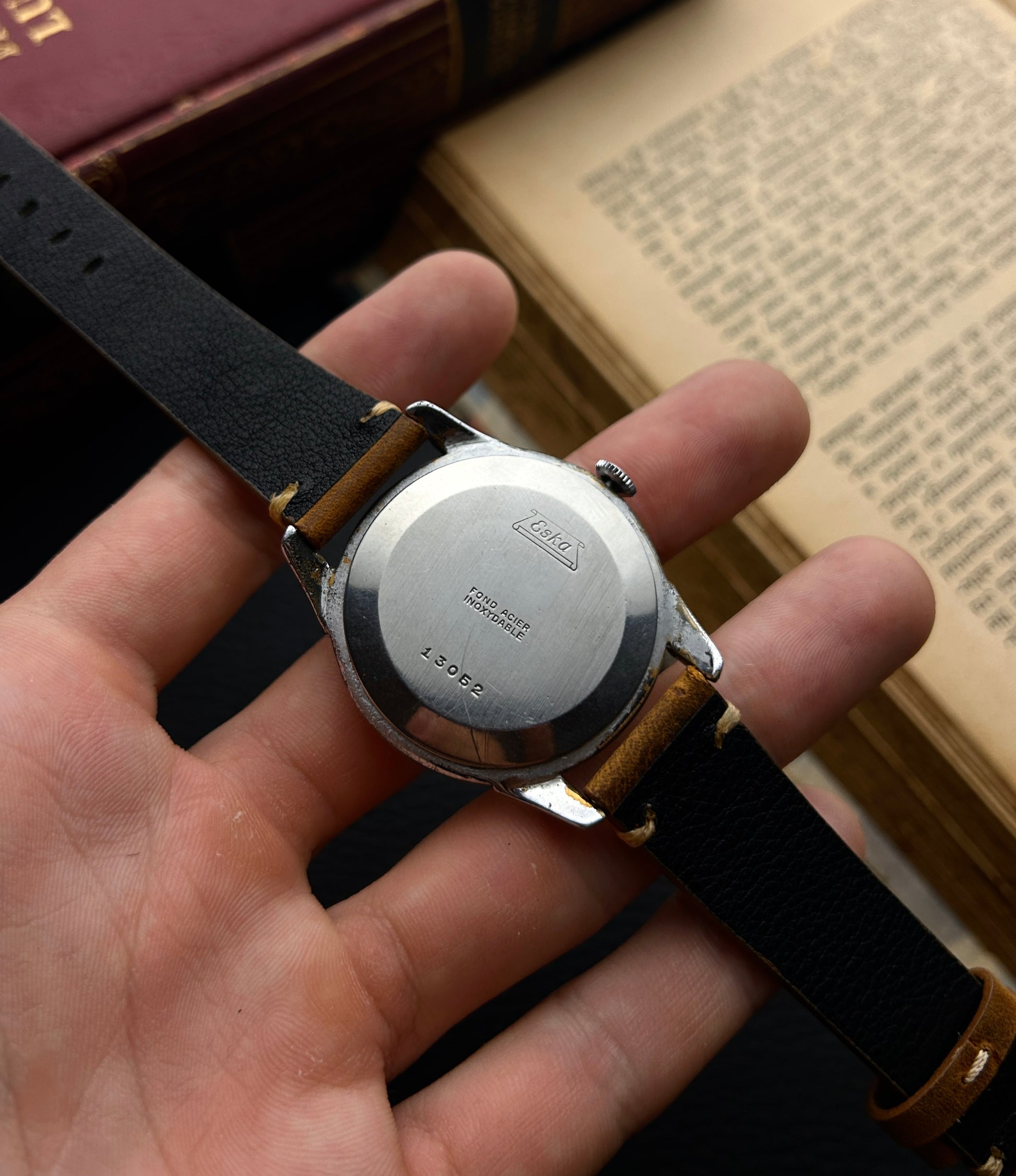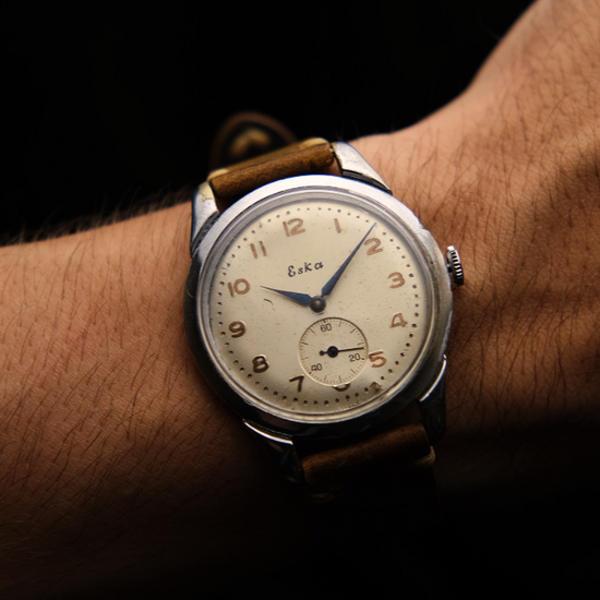Este elegante Eska é um exemplo autêntico da relojoaria suíça do pós-guerra. Seu mostrador em tom creme com algarismos dourados e subdial de segundos às 6h transmite o charme discreto dos relógios da década de 1940. Com proporções equilibradas e um design funcional, representa perfeitamente a estética clássica e utilitária que marcou o período.