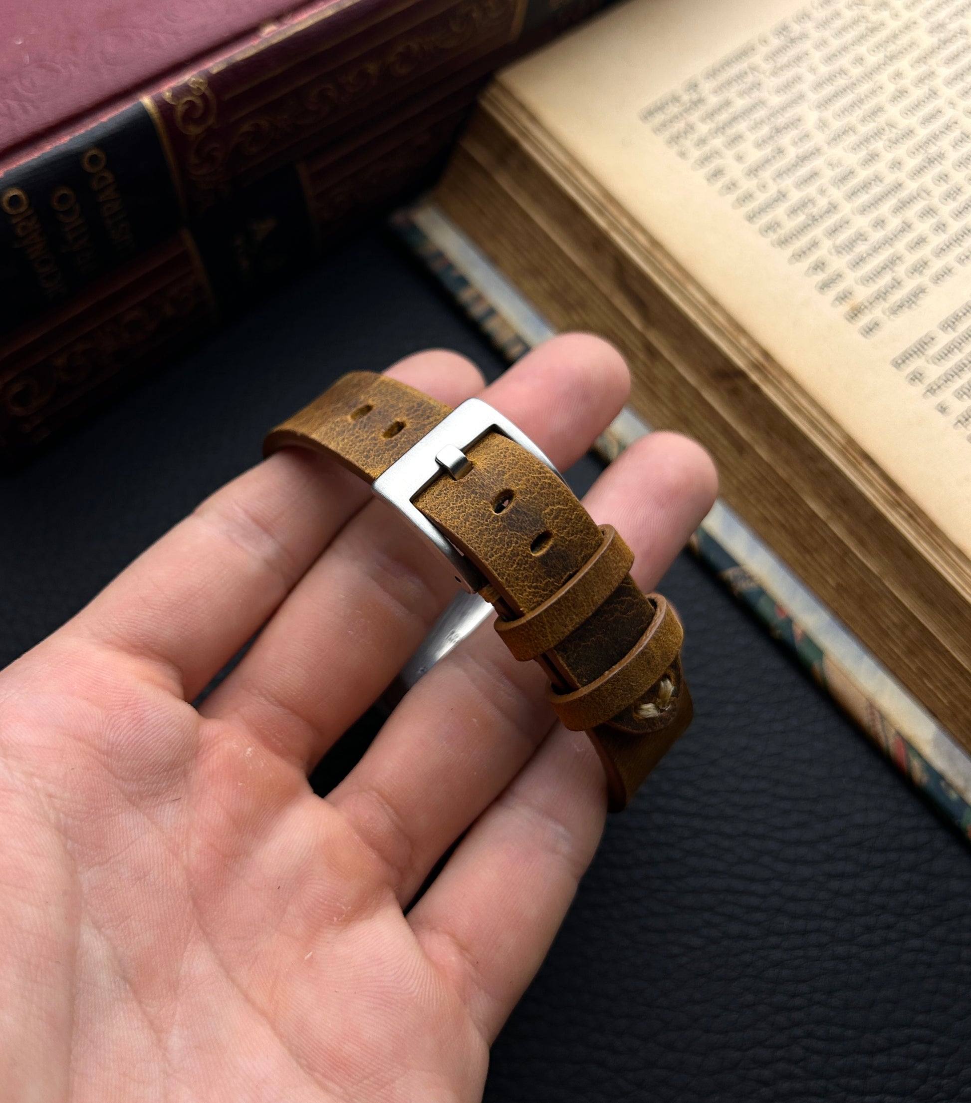• pulseira de couro marrom claro, combinando com o tom quente do mostrador
