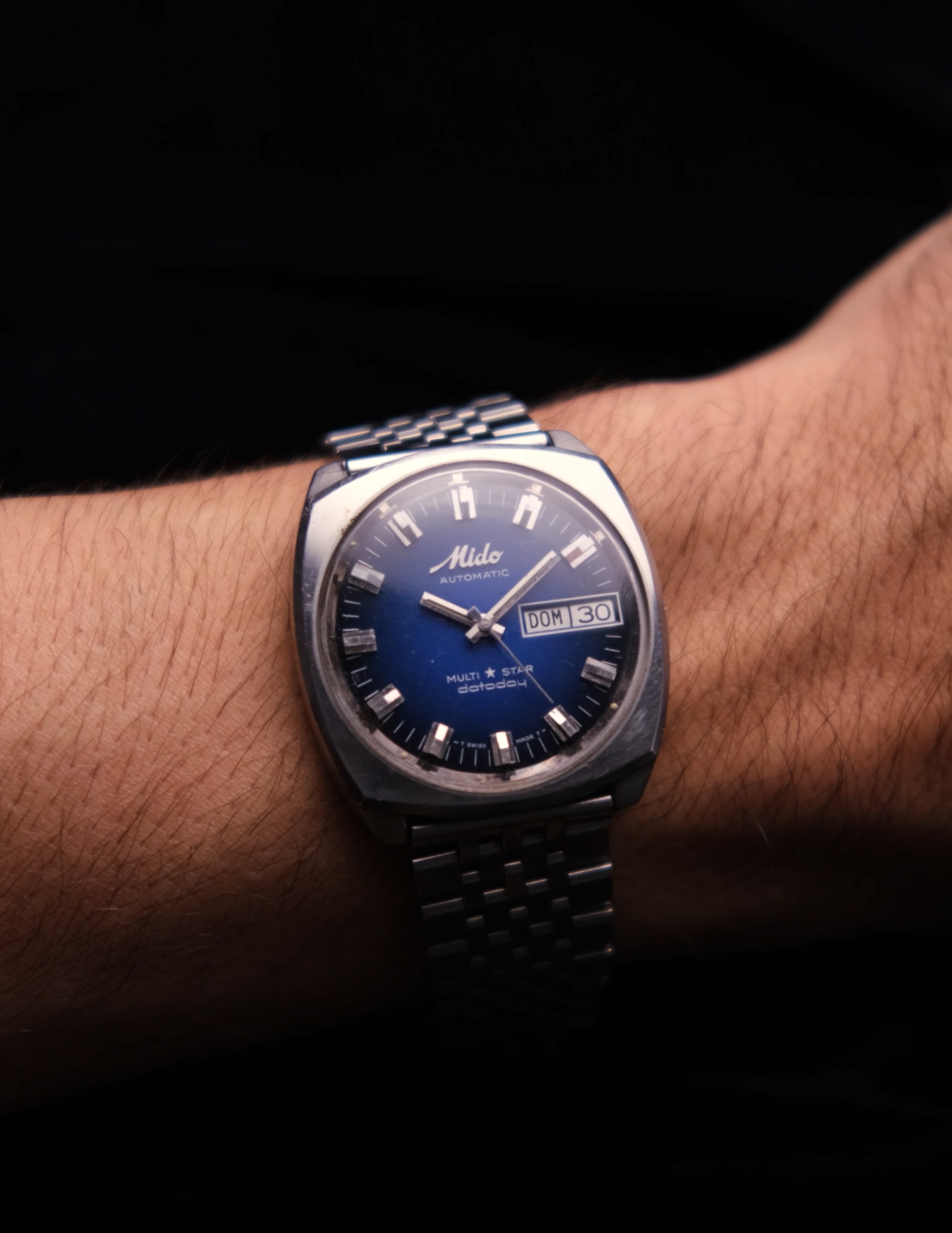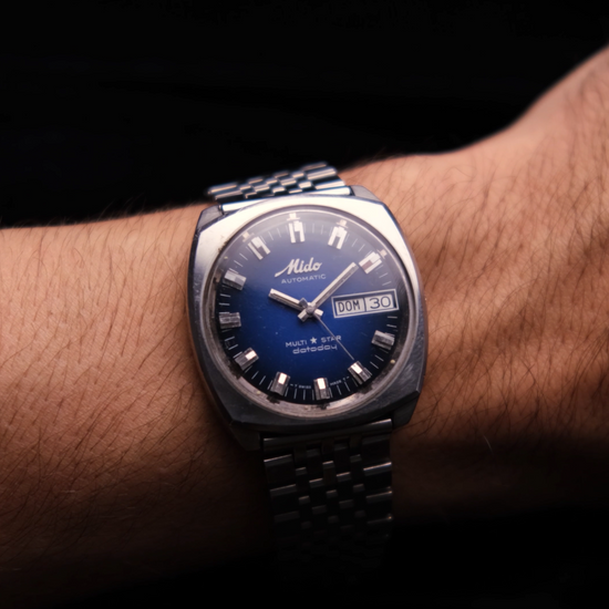 Este Mido Multi Star Datoday é um clássico robusto dos anos 70, com design esportivo e mostrador azul metálico vibrante. Seu visual retrô é marcado pela caixa em formato tonneau e o icônico display duplo de dia e data.