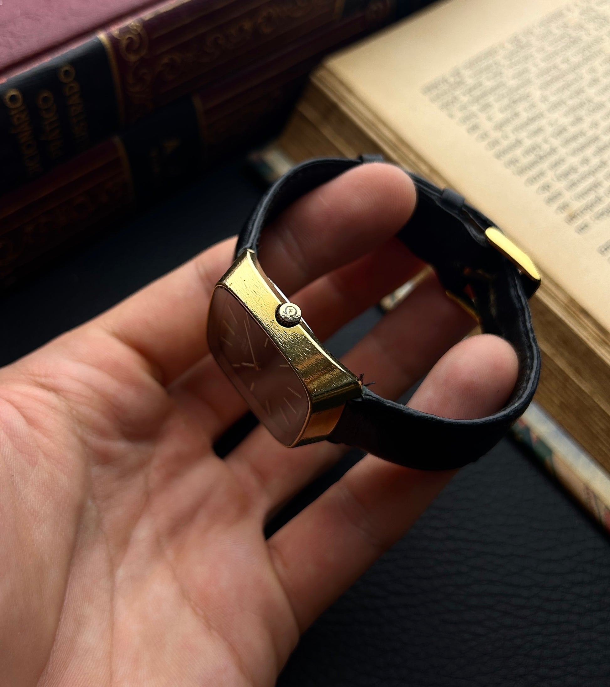 Este refinado Omega De Ville traz o charme característico da relojoaria dos anos 1970, com um design minimalista e elegante. Sua caixa quadrada folheada a ouro e mostrador preto escovado criam um contraste sofisticado, ideal para quem aprecia peças de estilo atemporal e discreta distinção.