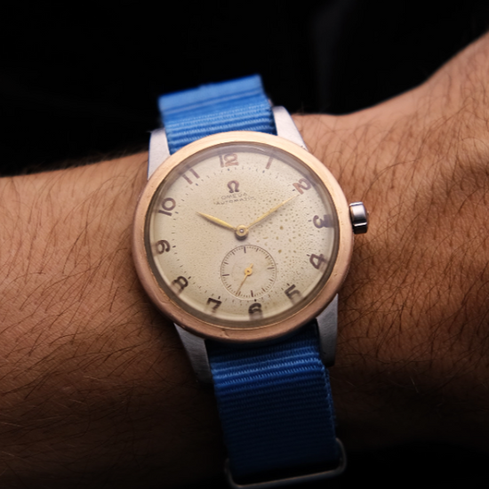 Um Omega vintage raro e encantador, unindo o design clássico dos anos 1940–50 com um mostrador de pátina autêntica e o charme de uma configuração com pequenos segundos. Sua caixa bicolor, em aço e aro dourado, reforça a sofisticação da época.