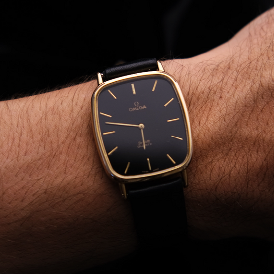 Este Omega De Ville Quartz combina sofisticação minimalista com o design elegante característico da linha De Ville. Sua caixa retangular com cantos suavemente arredondados, em tom dourado, reforça o estilo clássico dos anos 1970–80.