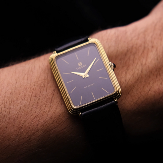 Um Tissot Stylist elegante e minimalista, exemplo da relojoaria suíça dos anos 1970 com design refinado e proporções clássicas.