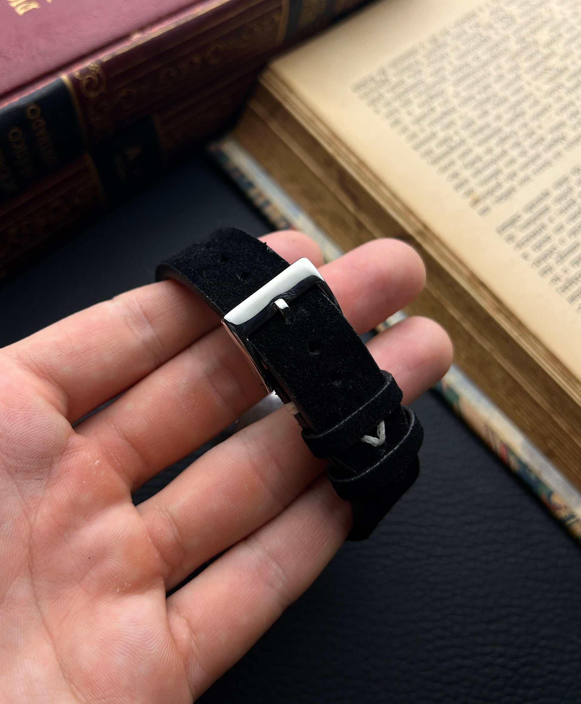 • pulseira de camurça preta com costura branca contrastante, em estilo militar vintage
